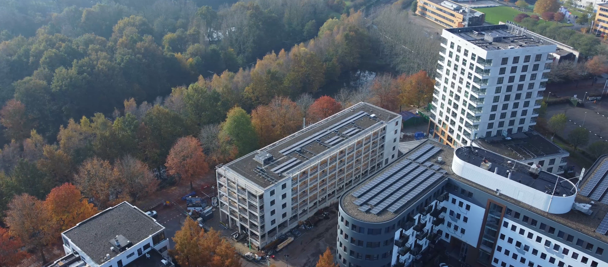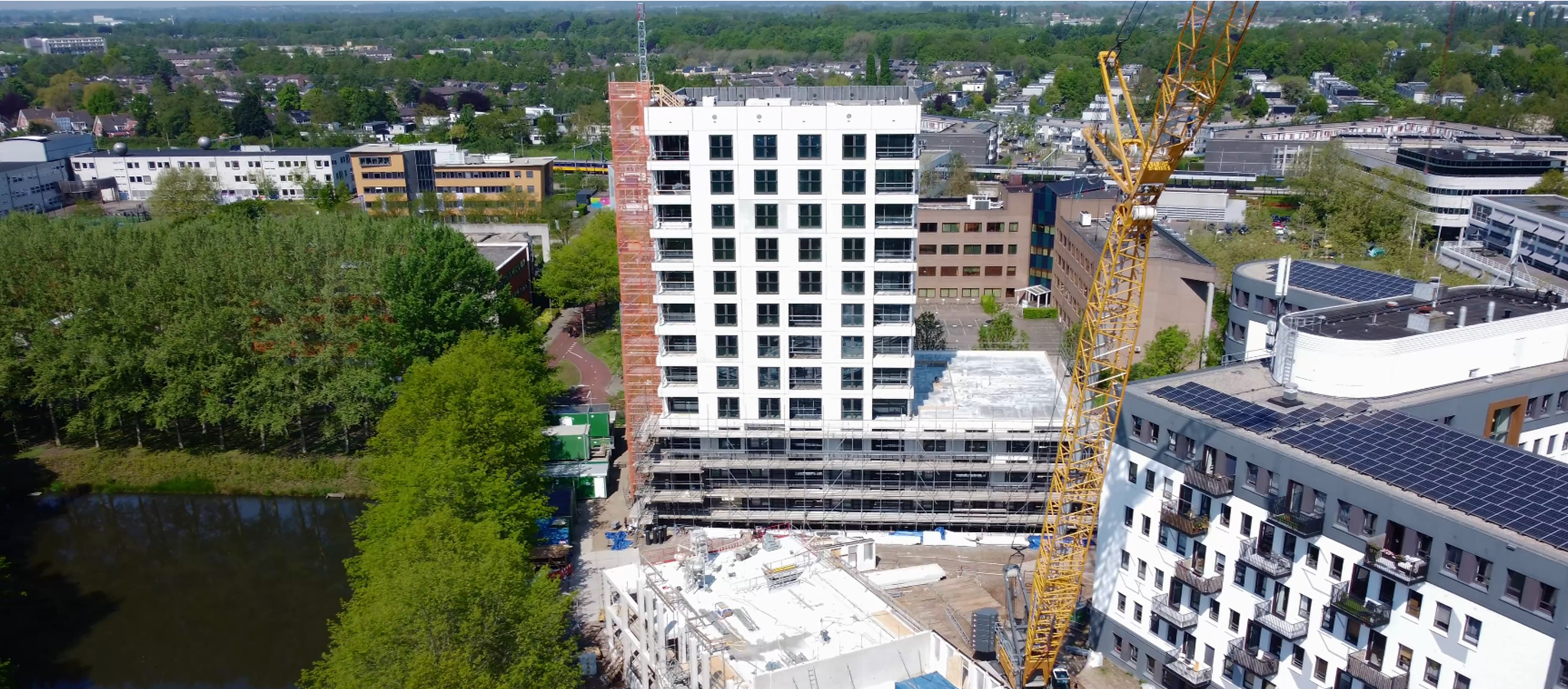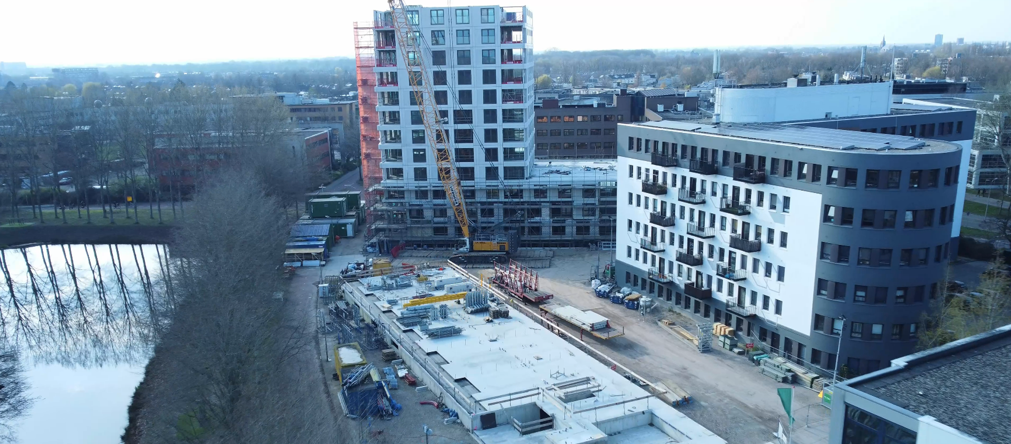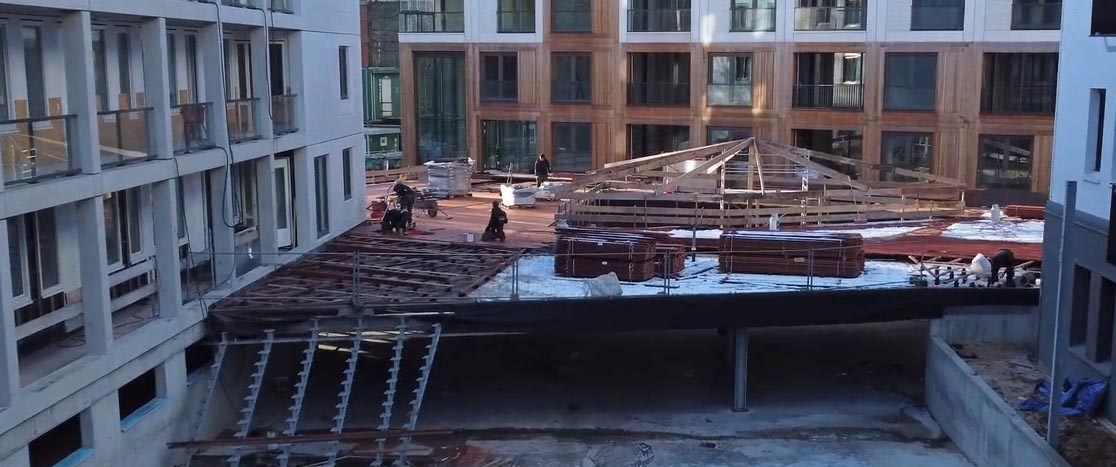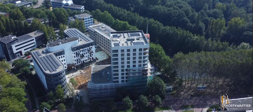 Medio augustus 2023 vlogen we met de drone langs de galerijen van gebouw B en zien we dat er op het dak voorbereidingen worden getroffen om straks het sedum groen te plaatsen. En ook supermooi om te zien; Het hoge gebouw A is deels uit de steigers! Hierdoor worden de prachtige houten accenten aan de gevel echt goed zichtbaar. Kijk je weer mee met de nieuwste dronevideo?