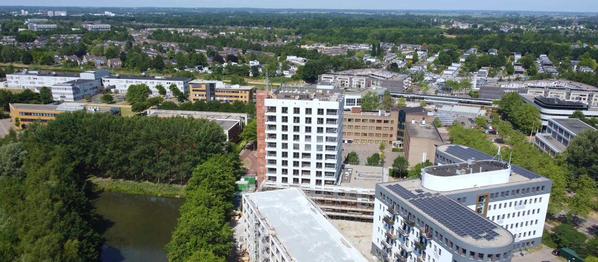 Ook in juli is de dronevideograaf op de bouwplaats van De Lichtpen geweest om vanuit de lucht alle vorderingen in beeld te brengen. Zo zijn nu met name de werkzaamheden aan gebouw B goed zichtbaar, daar wordt onder andere momenteel de dakbedekking aangebracht. Maak een wandeling over de galerij en neem een kijkje binnen. Loop je mee?